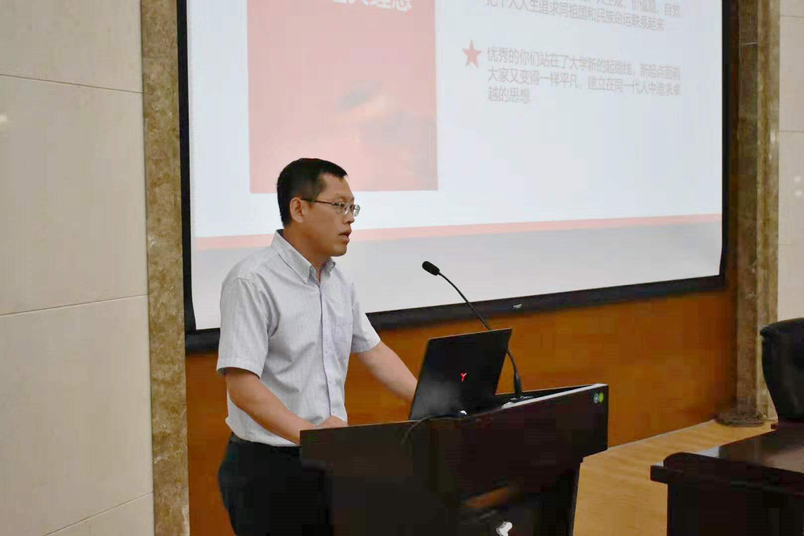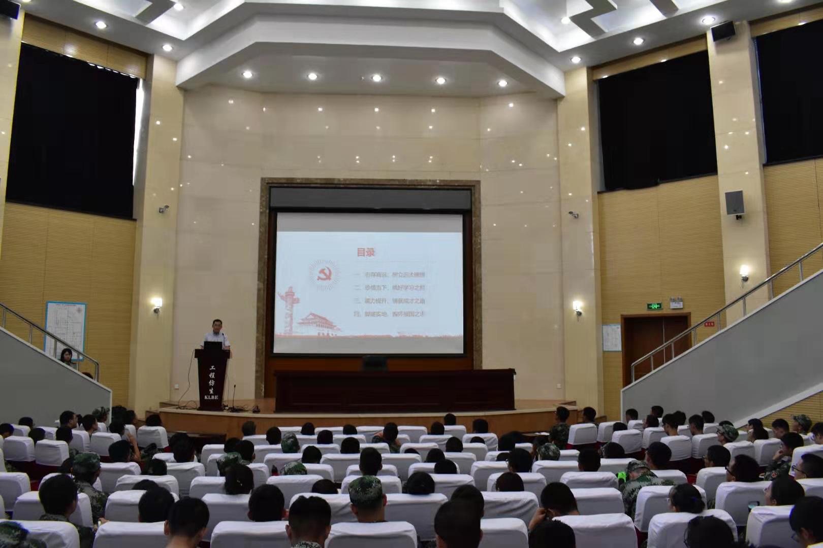 9月4日,在南岭校区仿生楼报告厅,老王论坛 党委书记李善兴为全体新生上第一堂党课,勉励新入学学生坚定理想信念,展现青春力量。