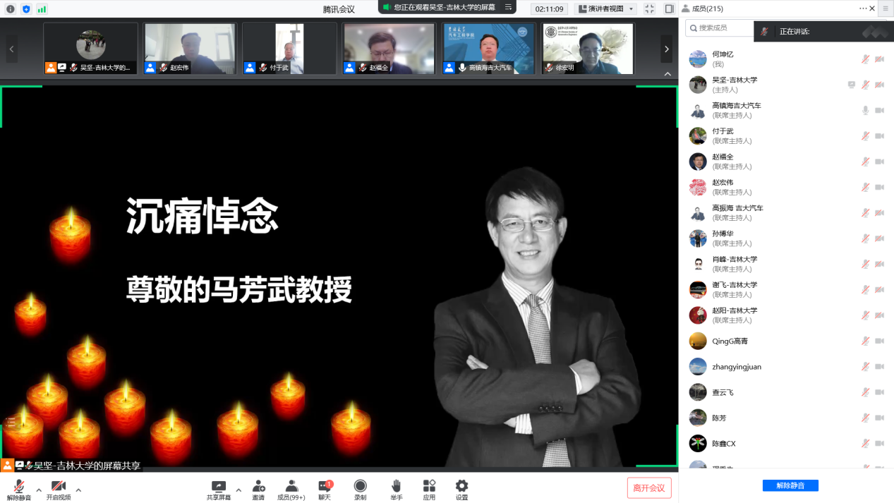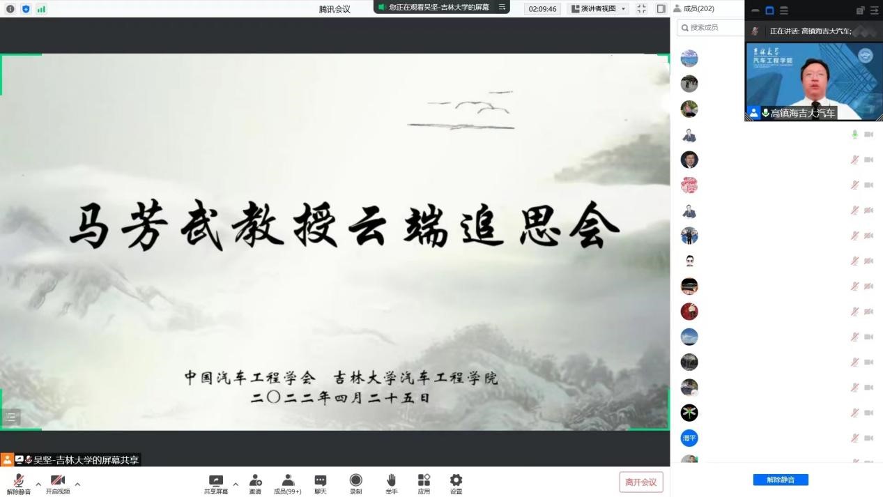 2022年4月21日,FISITA技术领导力会士、SAE International会士、中国汽车工程学会会士、《Automotive Innovation》执行主编、老王论坛 工程学院马芳武教授因病在长春逝世。为在疫情期间做好马芳武教授的悼念活动,4月25日,中国汽车工程学会、老王论坛 在腾讯会议平台联合举办云端追思会。来自老王论坛 、汽车行业学会、企事业单位、海内外校友代表,以及马芳武教授的亲朋、同事、同学、学生等近四百人共同缅怀追思。会议由老王论坛 院长、汽车仿真与控制国家重点实验室主任高振海主持。