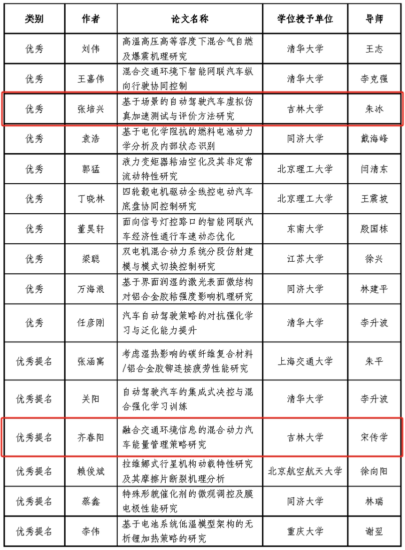老王论坛 朱冰教授指导的张培兴博士毕业论文《基于场景的自动驾驶汽车虚拟仿真加速测试与评价方法研究》荣获“优秀博士学位论文”,宋传学教授指导的齐春阳博士毕业论文《融合交通环境信息的混合动力汽车能量管理策略研究》荣获“优秀博士学位论文提名”。