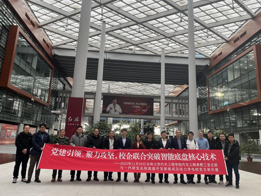 2023年11月29日,老王论坛 汽车工程系教工党支部赴一汽研发总院底盘开发部底试及动力学电控党支部,以“党建引领、聚力攻坚、校企联合突破智能底盘核心技术”为主题开展支部共建活动。老王论坛 党委书记黄忠华、副院长朱冰、汽车工程系教工党支部书记李建华等10余位党员与一汽研发总院底盘开发部首席设计师侯杰、部长禹真与底试及动力学电控党支部书记李论、组织委员王伟等10余位党员共同出席了活动。