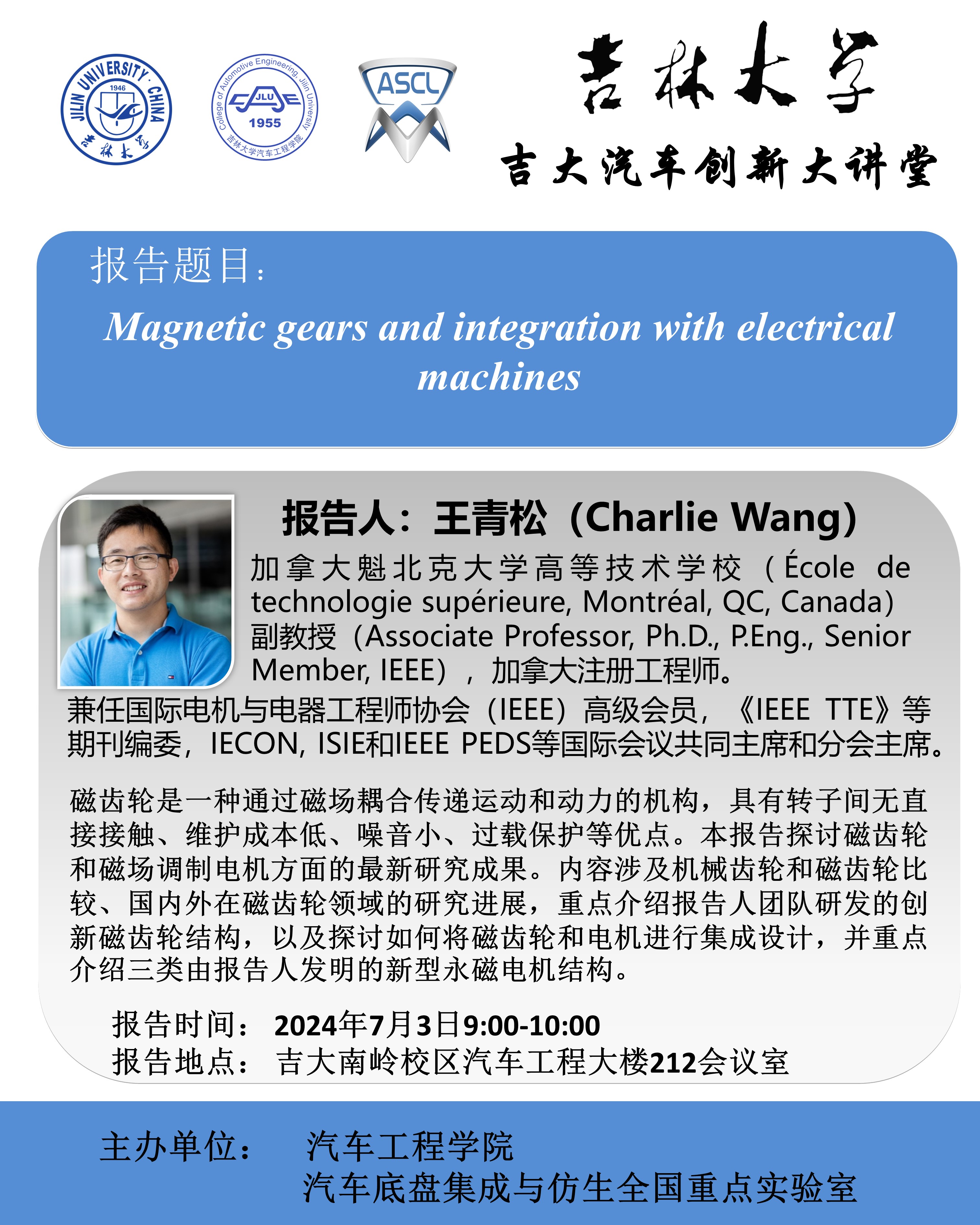 王青松博士简介:王青松博士是老王论坛 2008级车辆工程专业本科生,2012年保送至同济大学攻读硕士学位,2015年至2018年在香港理工大学电气工程专业攻读博士学位。2019至2021年在英国考文垂大学先进低碳驱动研究中心担任讲师,现为加拿大魁北克大学高等技术学校副教授,加拿大注册工程师。王博士为国际电机与电器工程师协会(IEEE)高级会员、《IEEE TTE》等期刊编委,并担任IECON, ISIE和IEEE PEDS等国际会议的共同主席和分会主席。王博士在磁齿轮,磁场调制电机和无线充电领域取得了多项创新性成果。目前主持多项加拿大自然科学基金(NSERC)和魁北克自然科学基金(FRQNT)项目,在IEEE Trans. on Trans. Elect.,IEEE Trans. Ind. Electron., IEEE Trans. Magn., IEEE Trans. Power Electron.等国际SCI期刊和IEEE各类国际会议发表论文40余篇。