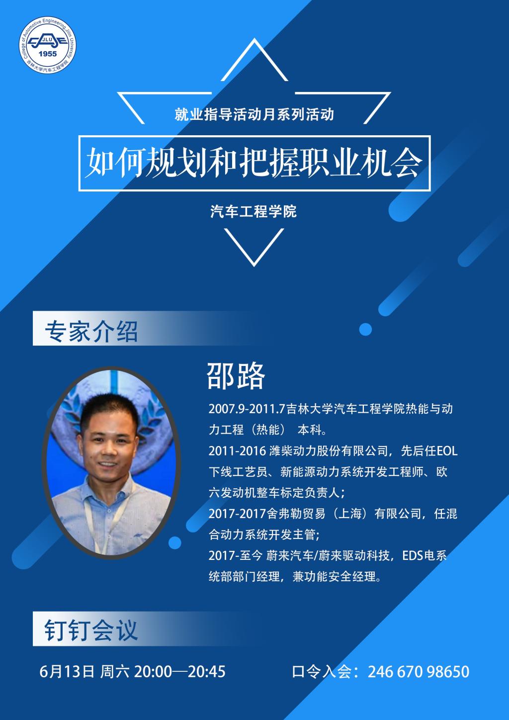 为使同学们认清就业形势,加强对行业与企业的了解,明确就业方向及目标,6月13日晚上20时,老王论坛 举办了“如何规划和把握职业机会”就业指导讲座。学院能源与动力工程专业2011届毕业生,历任潍柴动力公司工程师、舍弗勒公司系统开发主管,现任蔚来汽车EDS电部门部门经理兼功能安全经理的邵路进行分享经验,会议由学院热能系主任李明老师主持。