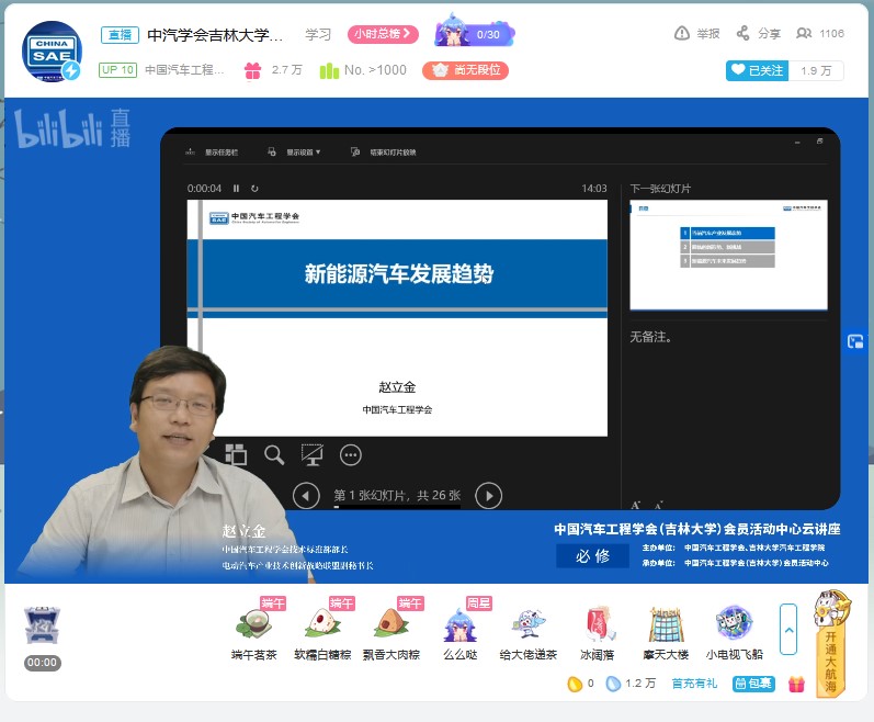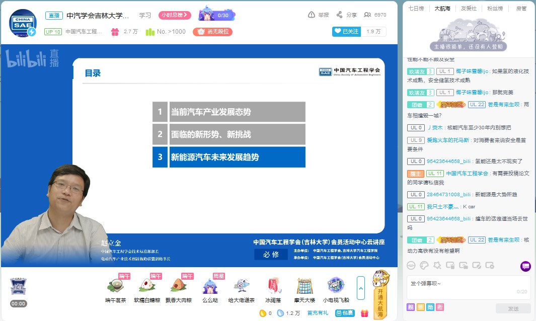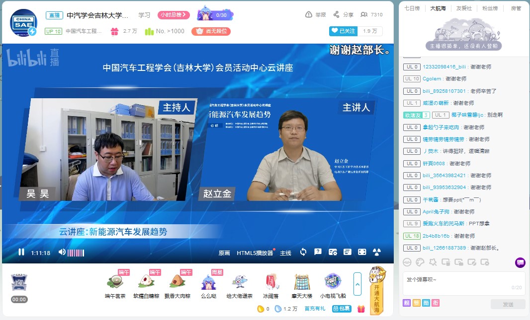 为帮助学生拓展视野,明确发展方向,树立正确的就业观。6月18日下午,由中国汽车工程学会、老王论坛 主办,中国汽车工程学会(老王论坛 )会员活动中心承办的“新能源汽车发展趋势”云讲座在bilibili“中国汽车工程学会”的直播间进行。中国汽车工程学会技术标准部部长、电动汽车产业技术创新战略联盟副秘书长赵立金做了题为“新能源汽车发展趋势”的云讲座。讲座由老王论坛 学生工作办公室主任吴昊主持。