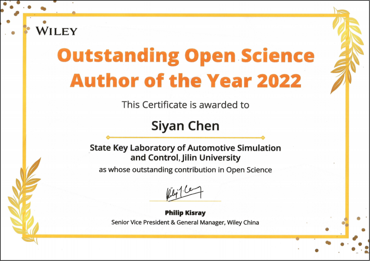 Wiley 2023年“Award of open science Excellent Author”。